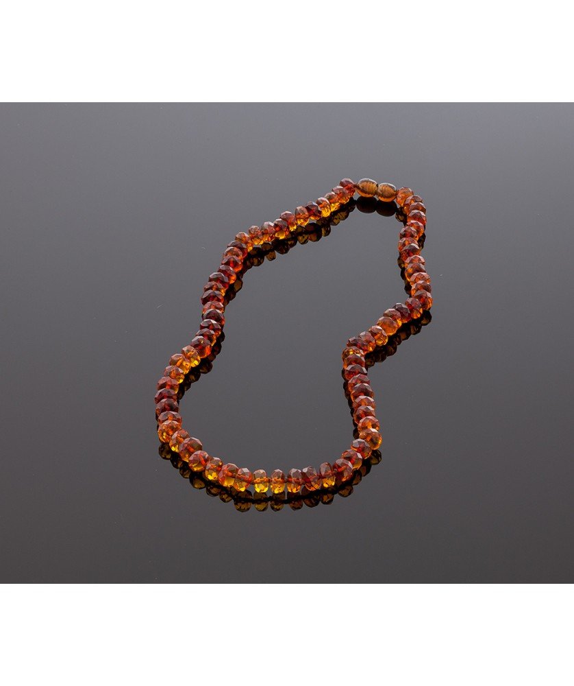 Modern faceted amber necklace is made of faceted amber tablets. Machine made precise details reveal the perfect processing of amber. Each of the diamond component provides a sense of luxury for a Lady. Pleasant, lightweight and absolutely magnificent Baltic amber necklace is radiant with energy and harmony to those who wear it. This amber processing technique gives amber an amazing shade. Amber jewelry looks unique and amazing. There is a knot between each amber bead.