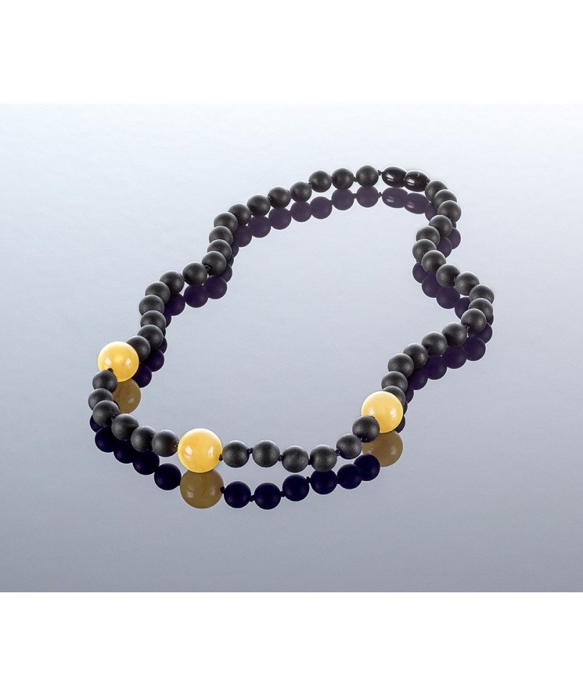 Black amber necklace is made of 100% Baltic amber unpolished round shape beads. Black amber beads are pressed. Softly round Baltic amber beads of 7 mm in size perfectly combine with yellow color amber beads in the middle, which are polished and not pressed. This two-color composition looks very nice. Closure is made of plastic.