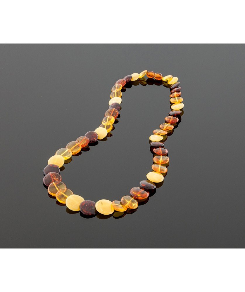 Baltic amber necklace is made of handmade Baltic amber tablets. The multicolored necklace gives the sense of exclusivity. Closure is made of plastic. The length of the necklace is ~ 53 cm. The weight of the necklace is ~ 26 gr.