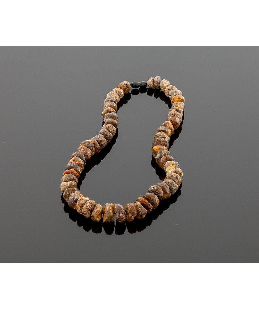 Genuine amber necklace is made of natural Baltic amber shapes with natural cortex. The amber jewelry with the cortex is especially suitable for therapeutic and medical purposes. Closure is made of plastic. The length of the necklace is ~ 52 cm. The weight of the necklace is ~ 56,4 gr.
