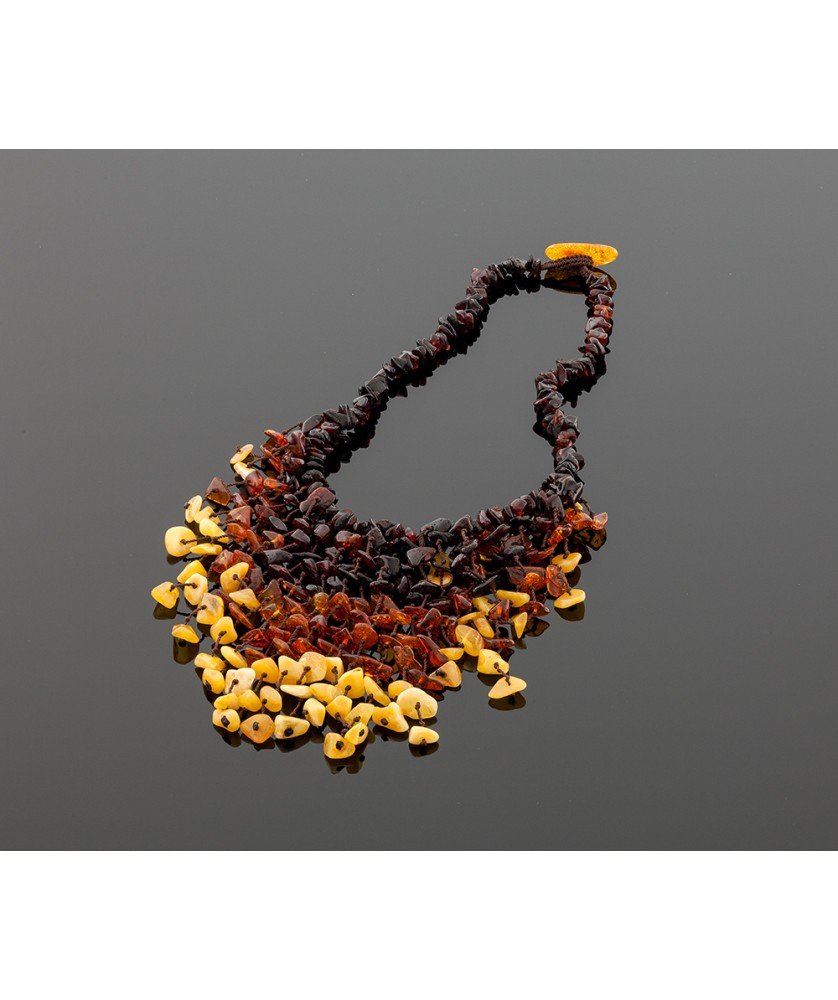 Carefully hand braided amber necklace. Cognac, dark cognac and yellow colors of small amber pieces are perfectly lined up and braided. Closure is made of amber. The length of the necklace is ~ 42 cm. The weight of the necklace is ~ 46 gr.