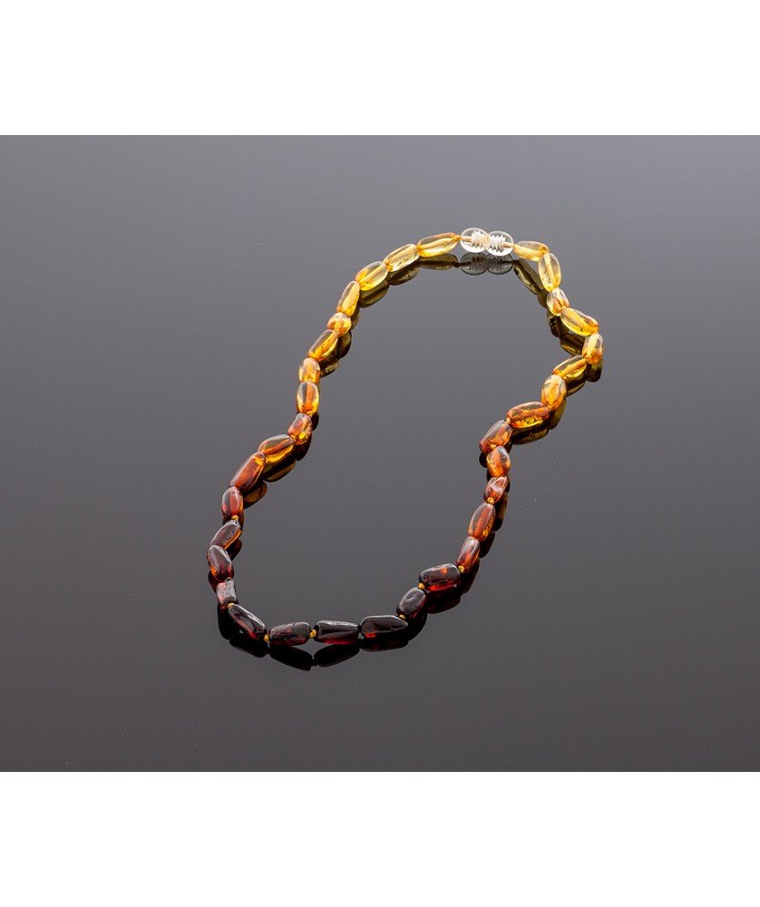 Adult amber necklace is made of olive/bean amber beads. Neatly sorted amber rainbow olives from the lightest to the darkest color. Freeform beads perfectly combine with each other. There is a knot between each olive bead. Closure is made of plastic. The length of the necklace is ~ 45 cm. The weight of the necklace is ~ 8,7 gr.