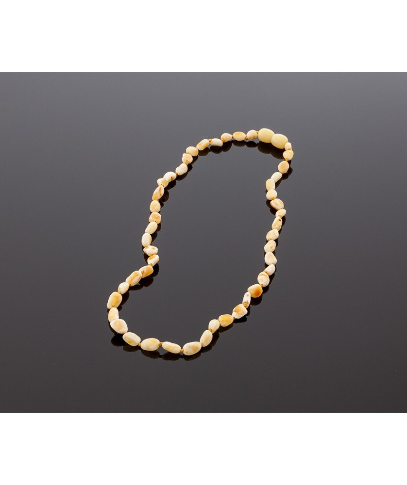 Adult amber necklace is made of white olive/bean amber beads. Freeform amber beads perfectly combine with each other. There is a knot between each olive bead. Closure is made of plastic. The length of the necklace is ~ 45 cm. The weight of the necklace is ~ 5,9 gr.