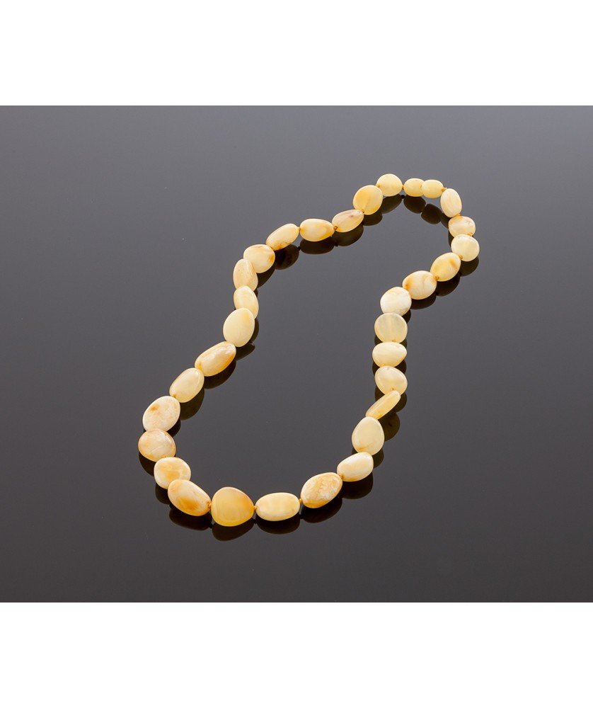 Classic style amber necklace is made of milky stylish beads. Pleasant, lightweight and very beautiful Baltic amber necklace is radiant with energy and harmony to those who wear it. The unique and amazing property of natural amber is that it offers a natural relief of pain. Anti-inflammatory properties make it ideal natural homeopathic product for adults. There is a knot between each amber bead. Closure is made of plastic. The length of the necklace is ~ 47 cm. The weight of the necklace is ~ 19,8 gr.