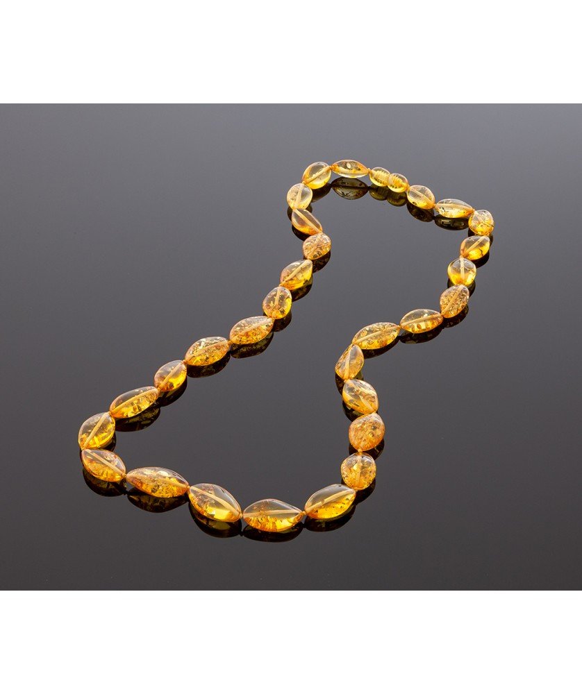 Classic style amber necklace is made of light cognac amber stylish beads. Pleasant, lightweight and very beautiful Baltic amber necklace is radiant with energy and harmony to those who wear it. The unique and amazing property of natural amber is that it offers a natural relief of pain. There is a knot between each amber bead. Closure is made of plastic. The length of the necklace is ~ 58 cm. The weight of the necklace is ~ 22,2 gr.