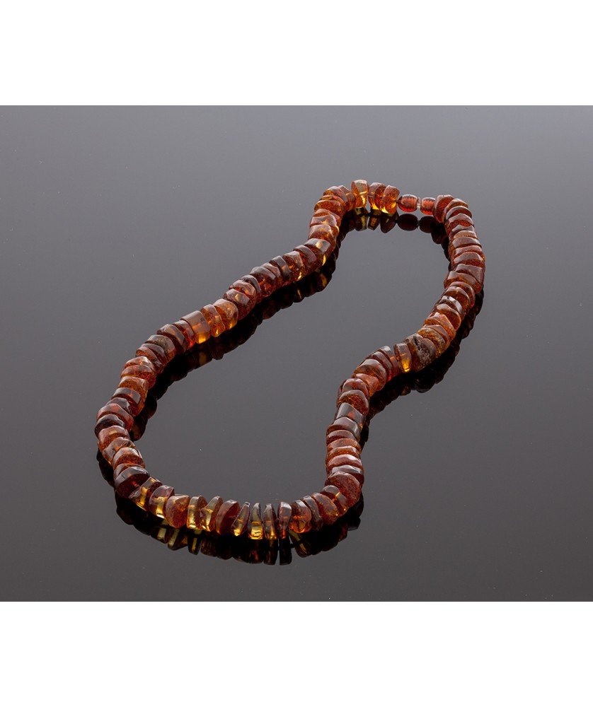 Stylish handmade amber necklace consists of cognac Baltic amber tablets. This cognac color necklace gives subtle classical sense. Freeform parts perfectly combine with each other. Pleasant and very beautiful Baltic amber necklace is radiant with energy and harmony to those who wear it. Also suitable for Gentelmen. Closure is made of plastic. The length of the necklace is ~ 54 cm. The weight of the necklace is ~ 46 gr. The size of amber up to ~ 0,3x1,3 cm.