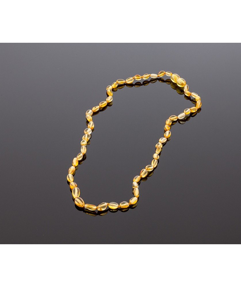 Adult amber necklace is made of lemon-colored olive/bean amber beads. Freeform amber beads perfectly combine with each other. There is a knot between each olive/bean bead. Closure is made of plastic. The length of the necklace is ~ 45 cm. The weight of the necklace is ~ 5,4 gr.